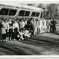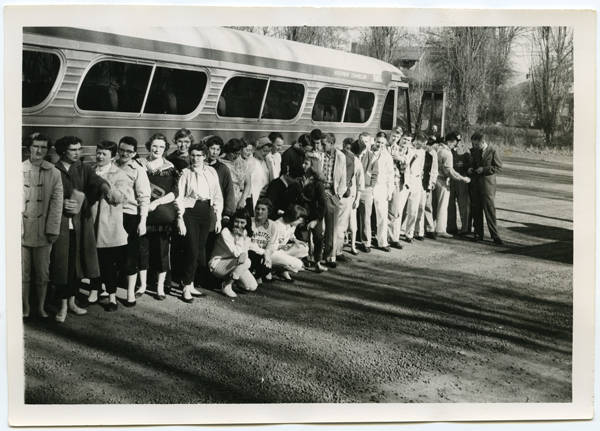 Photograph of Pacific University students standing outside a bus. This may be a photo of students on a choir tour.
