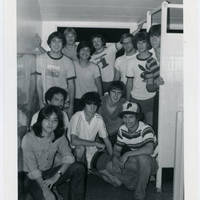 Group of male students posing in the bathroom of a residence hall in late 1970s.