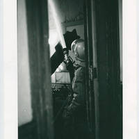Fireman hosing down interior of Marsh Hall
