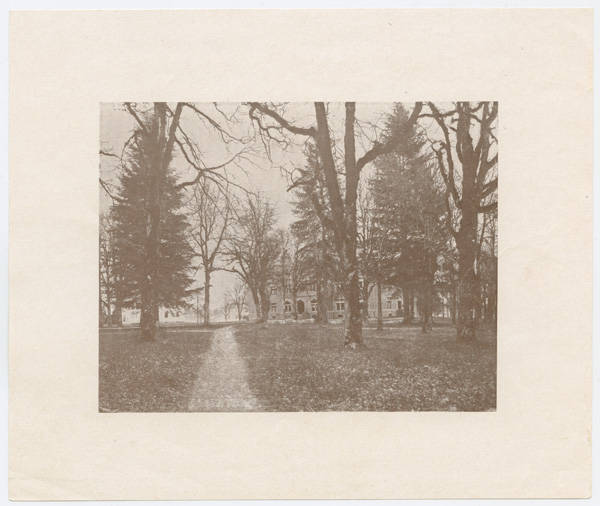 Distant view of the dirt pathway leading to Marsh Hall, with Academy Building on the left. Marsh Hall, the main administrative building for Pacific University, was finished in 1895. Academy Hall burned down in 1910.