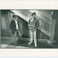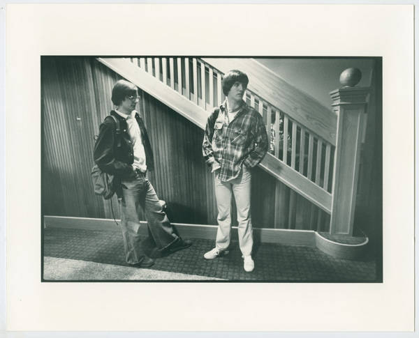 Two unidentified students standing in front of the stairs in the first floor Marsh Hall lobby. One unidentified student sits on stairs in background.
