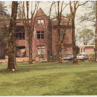Exterior view of Marsh Hall during reconstruction after the fire with the Harvey W. Scott Memorial Library visible in the background to the right.