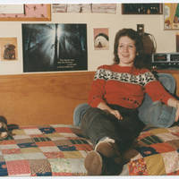 Unidentified female student sitting on her bed in the Walter Hall dormitory.