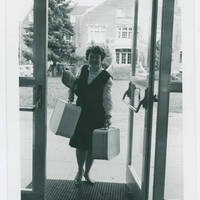 Freshman Gail Griffiths entering Walter Hall entrance with suitcases. Image published in 1965 Heart of Oak, on page 8.