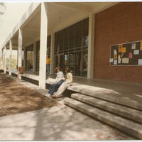 Two unidentified women on the steps of Washburne Hall, also called the University Center or UC.