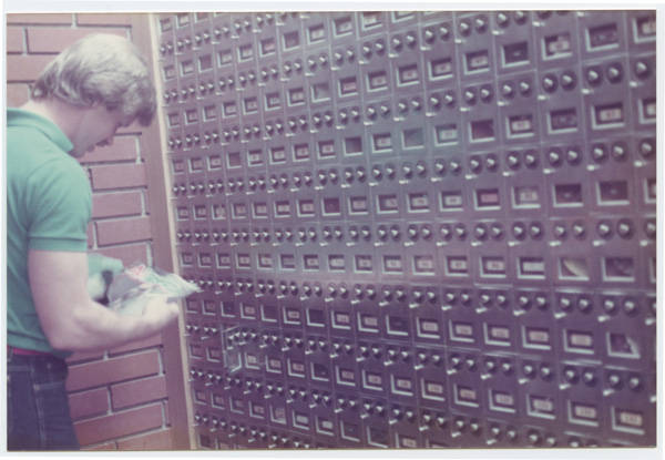 A Pacific University student gathering his mail, standing in front of the mail boxes in the University Center.