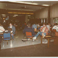 Pacific University students sitting and talking at tables located in the University Center, or UC, which is also called Washburne Hall.