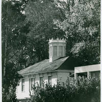 - Photograph of the Old College Hall roof, partially blocked by bushes and trees.