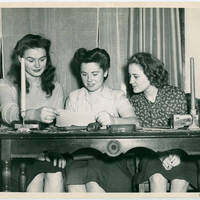 Photograph of three unidentified members of Pacific University's Theta Nu Alpha sorority, sitting at a meeting.