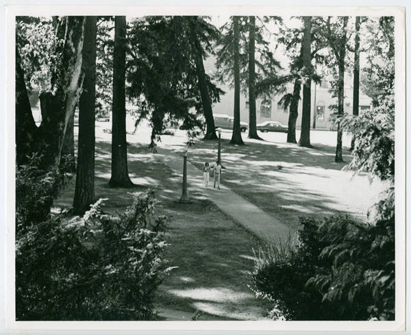 Photograph of an unidentified couple taking a stroll through the Pacific University campus.