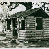 Photograph of a cabin covered with flyers for the Centennial Stomp at the 1949 Centennial Celebration.