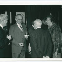 Photograph of Dr. James V. Miller conversing with several unidentified party guests. He was the president of Pacific University from 1970 to 1983.