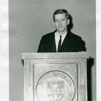 Unidentified administrator standing in front of the Pacific University podium. The oak podium has a carved Pacific University seal with motto.