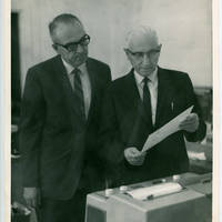 Portrait of Dr. Fred Scheller (on left) and an unknown man in front of an office machine.