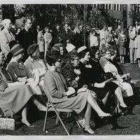 An audience seated outside of Marsh Hall. Marsh Hall is misidentified as Jefferson Hall on the back of the photo. The woman in the front row, third far left, is identified as Mrs. Josephine Ritchie.