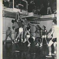 Members of Pacific University's men's basketball team jump to catch a rebound.