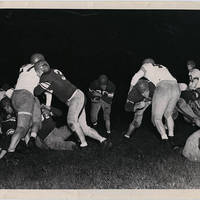 An action shot of Stan Russell, a Pacific University football player, running with the ball.