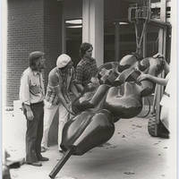 Setting up a piece of public art near the library at Pacific University. Among the students is Tom Barreto.