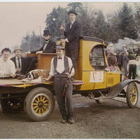 Several young men dressed in period outfits sitting on a truck, one in particular looks like Abraham Lincoln. In the background there are several more individuals in period dress. On the truck are Greek letters suggesting they are members of a fraternity. This might possibly be a Founder's Day celebration at Pacific University.