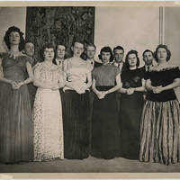 This photograph was featured in a December 1970 Pacific University alumni magazine article, which asked if any alumni remembered who or what event was pictured. Alumna Vangie M. Matta, class of 1951, wrote back with the following information: "I remember it well. Yes indeed, in 1949 we were 'doing our thing' by posing properly serious as we were told madrigal singers should. Shortly after this photo was taken we were presented with fine velveteen costumes for converts here and while touring the Northwest. Among those pictured are Phyllis Jahnsen Lund, Mariellen Bakke, Margaret Gaston Cooper, Gerry Wren Loper, Iris Roy Little, Ken Michener, Ed Grindsrud, Dean Matthews, our accompanist, Bob Geiger and missing was Jim Haight. Mr. James Carley was our director." (Pacific Today, June 1971, p. 33)