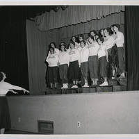 A group of female Pacific University students sing in matching Pacific t-shirts and rolled jeans.