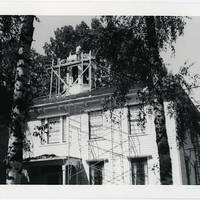 Old College Hall during its restoration with scaffolding and workers on the roof.