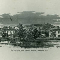 [front] Old wood cut of Pacific University campus as it appeared in 1870.