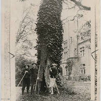 [newspaper clipping on back] CENTER OF 'SWEET' STORY--This was 'Grandma Brown's Bee Tree,' long famed as campus landmark at Pacific university in Forest Grove. For nearly century after it was originally doomed it stood, having originally gained fame by providing honey for Grandma Brown's charges during early Oregon sugar-shy days. Picture is from files of Pacific university 'Index.'