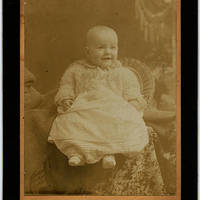 A formal portrait of an unidentified smiling infant. The photo was discovered in a drawer in the Old College Hall Museum at Pacific University.