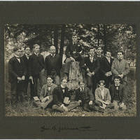A group of male Pacific University students and a professor pose for a photo around the petrified stump that is the remainder of the original log cabin built by A. T. Smith.