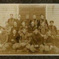 Pacific University's 1913 football team made up of Pacific University and Tualatin Academy students. They include Elbert John Taylor, Jakel [?], Oscar Alfred Axelson, Clinton Edgar Ostrander, Birns [?], Jay Richard Austin, James Robert Rasmusen, Vernon Ernest Burlingham, Ireland [?], Ivan Donaldson, Edwy Olds Dibble, Byron Matthew Goodman, Howard Rice Taylor, Paul Abraham [?], and Warren Ernest Tupper.