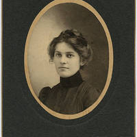 Portrait of an unidentified young woman with a bow in her hair. The photo was discovered in a drawer in the Old College Hall Museum at Pacific University. There is a name on the front of the photo but it is unreadable.