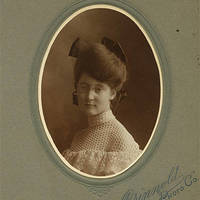 Portrait of a young woman with a large bow in her hair. The photo was discovered in a drawer in the Old College Hall Museum at Pacific University. There is a name on the front of the photo but it is unreadable.