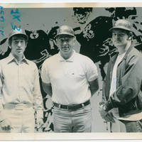 Three men pose for a picture at Pacific University [they might be athletic instructors].