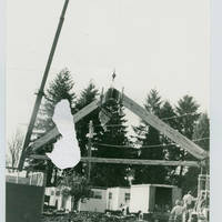 Picture of the roof beams being raised during the construction of the science building in February, 1980 at Pacific University. This building was later called Murdock Hall.
