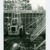 Picture of Murdock Hall construction with a forklift at Pacific University in February, 1980.