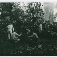 A photo of people helping clean up the debris on the ground after the Columbus Day Storm at Pacific University.
