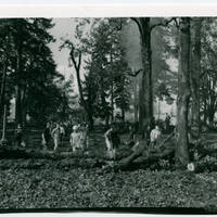 A picture of people at Pacific University helping clean up the fallen down trees after the Columbus Day Storm.