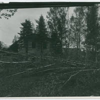 A fallen down tree after the Columbus Day Storm, in front of a building at Pacific University.