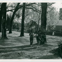 Two women cleaning up the fallen down trees and debris at Pacific University after the Columbus Day Storm in 1962.