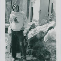 Prof. Jan Shield modeling the Art Zing t-shirt for the 1982 Art Zing at Pacific University.