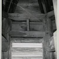Names students carved into the inside of the bell tower of Old College Hall before the reconstruction that took place in 1980. Some names are too faint to read. Identifiable names are Don Sanders, Elnora Sandford, Jean Yamase, Robert Allen Jones, graduate 1949, Harry E. Rockwood, graduate of 1946, Roy L. Swartz, graduate of 1949, and Don Kholmeier.