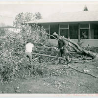 The Columbus Day Storm leaves, fallen down trees, and debris in 1962. Two men help clean up the aftermath of the storm in front of a building at Pacific University.