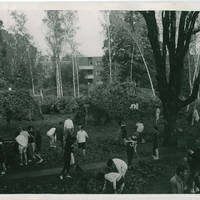 A black and white photo of volunteers helping rake up leaves at Pacific University after the Columbus Day Storm in 1962.