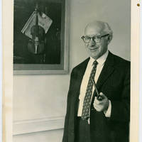 A black and white photo of Professor Raphael Spiro, pipe in hand, standing in front of a violin at Pacific University.