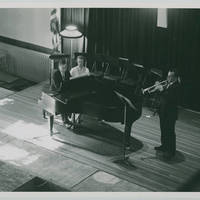 Unidentified trumpet soloist with an accompanying pianist; there is also a young woman sitting on the piano bench (might be turning pages for the pianist) at Pacific University.