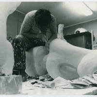 A black and white photo of a student in an art class working on a sculpture at Pacific University.