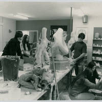 A photo of students working on their sculptures at Pacific University in a sculpture class.