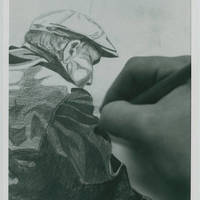 A photo of an unidentified student working in charcoal for a drawing of a man at Pacific University.