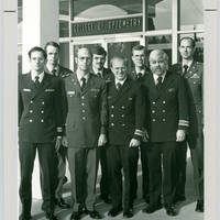 A group portrait of men wearing military uniforms, standing in front of the College of Optometry at Pacific University. All appear to be alumni of the school who later joined the military. On the extreme right is Jerry Davis, class of 1970.